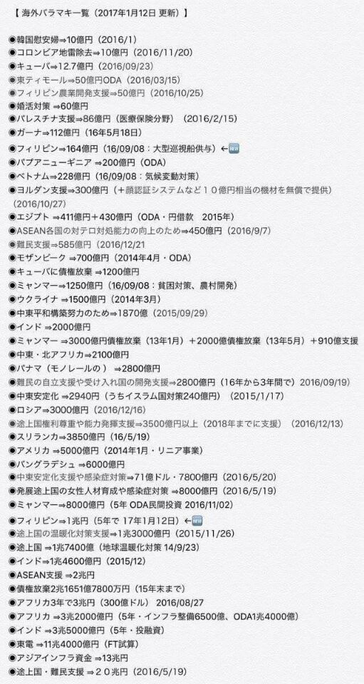 39 匿名さん 17/11/05(日) 22:04 イバンカ基金は国際基金だから問題ないとする輩がいますが、安倍氏のバラマキは57億どころか4年間で70兆と言われ、拠出金の用途の公開請求も無視し続けています。増税の前にやることあるわ。