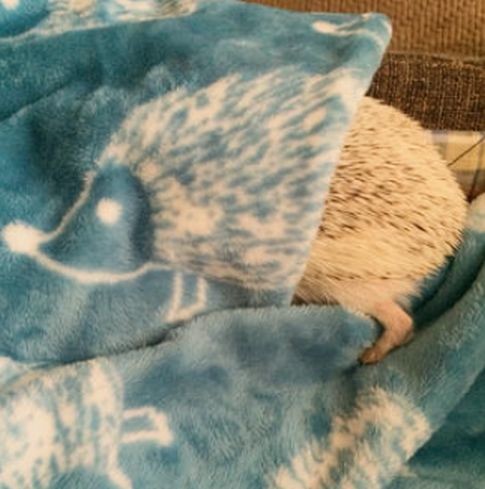 ハリネズミ柄のブランケットに包まれ眠る本物のハリネズミ
