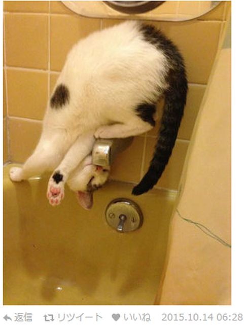 あえて困難な水の飲み方で修行する猫