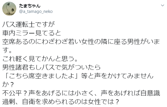 たまちゃんさんはご自身の判断で「(感染症予防、性犯罪抑止)のためのソーシャルデスタンス」「車内カメラにて動画記録有」をアナウンスしているとのこと。 しかし、どうしても死角があり全てを把握することは難しいため、乗客自身の配慮もお願いしたいそうです。『空席あるのに、わざわざ…』 バス運転士の「ある呼びかけ」に共感の嵐 | BUZZmag