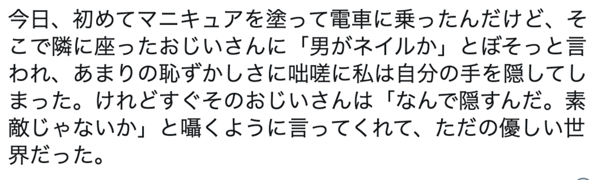 1 匿名さん 20/08/12(水) 23:55 https://grapee.jp/855245 投稿には、「素敵です」といった声がたくさん寄せられていました。 ・素敵ですね!こういう人が増えてほしいな。優しい世界。 ・もう性別関係なくネイルは広まっていると思う。「男だから~」とか関係ない。 ・いい話。うちの夫もネイルしていますよ!爪が割れにくくなるって喜んでいます。