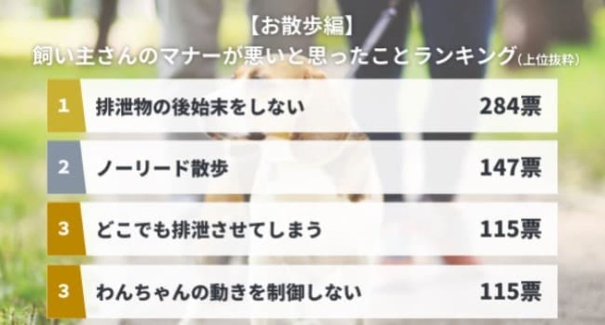 「犬の飼い主のマナーが悪いと思ったこと」ランキングの「お散歩編」。同率3位の「どこでも排泄させてしまう」「犬の動きを制御しない」、2位の「ノーリード散歩」を抑えた1位は? 全国の男女338人に聞きました。