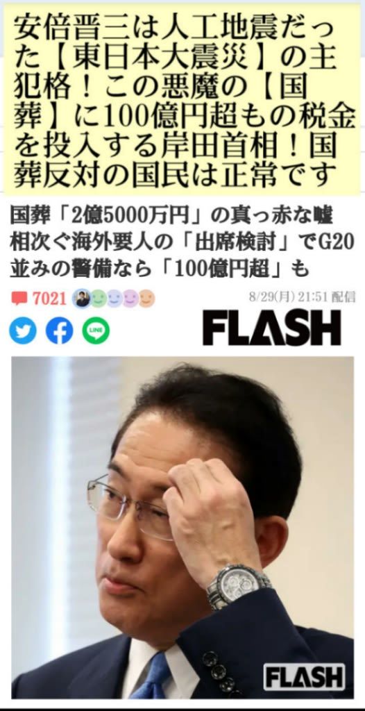 安倍晋三は人工地震だった【東日本大震災】の主犯格!この悪魔の【国葬】に100億円超もの税金を投入する岸田首相!国葬反対の国民は正常です!国葬【2億5000万円】の真っ赤な嘘!相次ぐ海外要人の出席検討でG20並みの警備なら100億円超も!FLASH/本物の安倍晋三はトランプ軍に既に処刑され葬儀済です!中曽根康弘・令和天皇【合同葬儀】の名の元!令和2年10月17日に!国葬「2億5000万円」の真っ赤な嘘相次ぐ海外要人の「出席検討」でG20並みの警備なら「100億円超」も(SmartFLASH)-Yahoo!ニュース(記事は下記に)………………………プーチン大統領が暴露!311東日本大震災【人工地震】米ペンタゴンの命令、自民党も主犯格!日本は地震を偽装した核実験を止めよ【悲劇の大川小学校】ここにいたら死ぬよ〈児...安倍晋三は人工地震だった【東日本大震災】の主犯格!この悪魔の【国葬】に100億円超もの税金を投入する岸田首相!国葬反対の国民は正常です!国葬【2億5000万円】の真っ赤な嘘!
