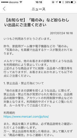 フリマアプリ「メルカリ」は7月24日、ゲーム機の「箱だけ」や「写真だけ」が、ゲーム機本体と誤認するような説明文・価格で出品されるケースがあるとし、同日までに対策を強化するとともに、ユーザーに注意を呼び掛けた。 メルカリでは7月20日ごろから、人気ゲーム機「Nintendo Switch」の本体を販売しているように見せかけながら、「外箱だけ」などを数万円で販売するユーザーが続出。メルカリは取り締まりを強化し、これまでに数十点の出品について、削除したり、購入済みの場合は取引をキャンセルしたという。 同社は24日、「「箱のみ」など紛らわしい出品にご注意ください」と題した注意喚起をアプリ内に掲示。「ほかのユーザーの誤解を招くような出品は禁止しており、そのような出品があった場合は出品者に警告している」と説明した。また、誤って購入してしまったり、届いた商品が説明と違う場合は、「受取評価」する前に同社に問い合わせれば、返金や補償などのサポートに応じるとしている。 メルカリでは過去に、「Play Station 4」(PS4)の「写真」が多数出品されていると話題になり、同社が対策したケースがあった。Switchの「箱だけ」高額で販売 メルカリが対策、ユーザーに注意喚起(ITmedia NEWS) - Yahoo!ニュース