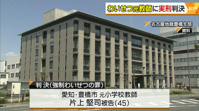 名古屋地方裁判所は懲役3年6カ月の実刑判決を言い渡しました。 判決を受けたのは、愛知県豊橋市の元小学校教師片上堅司被告(45)です。判決によりますと、片上被告は2011年から2015年の間に、当時7歳だった女の子ら3人の小学生に体を触るなどのわいせつな行為をしました。名古屋地裁豊橋支部は「小中学校の教員であった被告人が、児童にわいせつな行為をしたことの社会的影響を無視することはできない」などとして、片上被告に懲役3年6カ月の実刑判決を言い渡しました。強制わいせつの罪で元教師に実刑判決 愛知・豊橋市(メ〜テレ(名古屋テレビ)) - Yahoo!ニュース