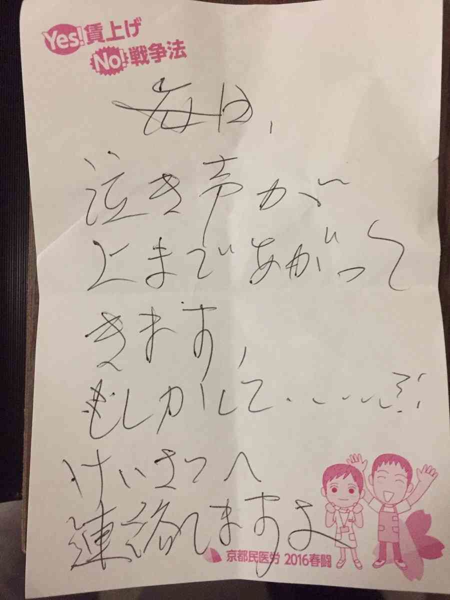 「現在、4カ月の子どもを妻とマンションで育てています。夜泣き等、大変ですが二人で必死にやりくりしています。そんななか、本日、以下のような紙がポストに入っていました。とても悲しい思いをしました。」 やるせない思いをあおきさんがTwitter上で明かしたところ、慰めの言葉から手紙の主に共感する声まで、さまざまな反応が寄せられています。 ・悪意しか感じられない手紙だ。赤ちゃんが夜泣きするのは、仕方がないことなのにね。 ・泣き声を聞いても、夜泣きか虐待か分からない。もしかしたら、本当に心配しているのかも。 ・こういう手紙をもらうと、残念な気持ちになってしまいます。気を落とさないで! ・「子育てのつらさを分かって」とか強要しないでほしい。なんで、関係ないこっちが我慢しなきゃいけないの?赤ちゃんの泣き声に「警察へ連絡しますよ」 近隣住民の手紙が物議をかもす