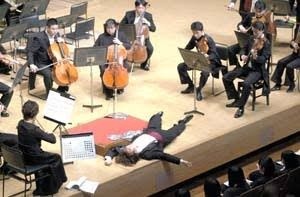 カーゲル《フィナーレ》 「指揮者は突然痙攣に見舞われたかのように硬直し、譜面台をつかんで背後の床に頭を向けて倒れる」 の楽譜の指示通りにした指揮者。