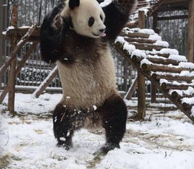 中国のパンダが雪で大喜び