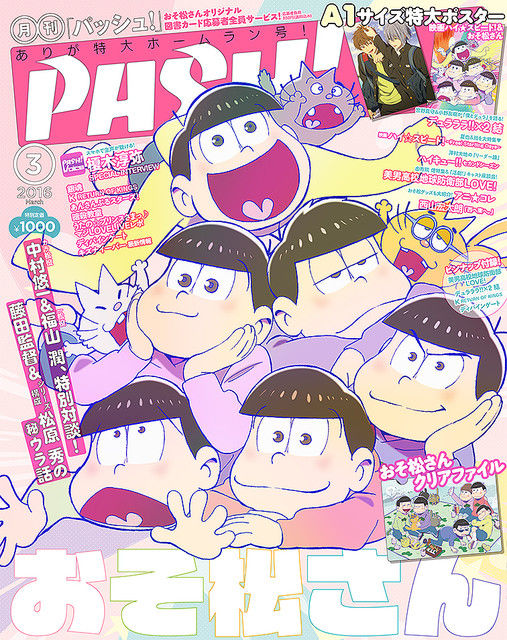 おそ松さんの大特集が組まれる「PASH!」3月号について取り上げている。1・2月号の完売を受け、3月号は10万部を超える部数を用意しているという。超特大A1サイズのポスターとクリアファイルの特別付録もある
