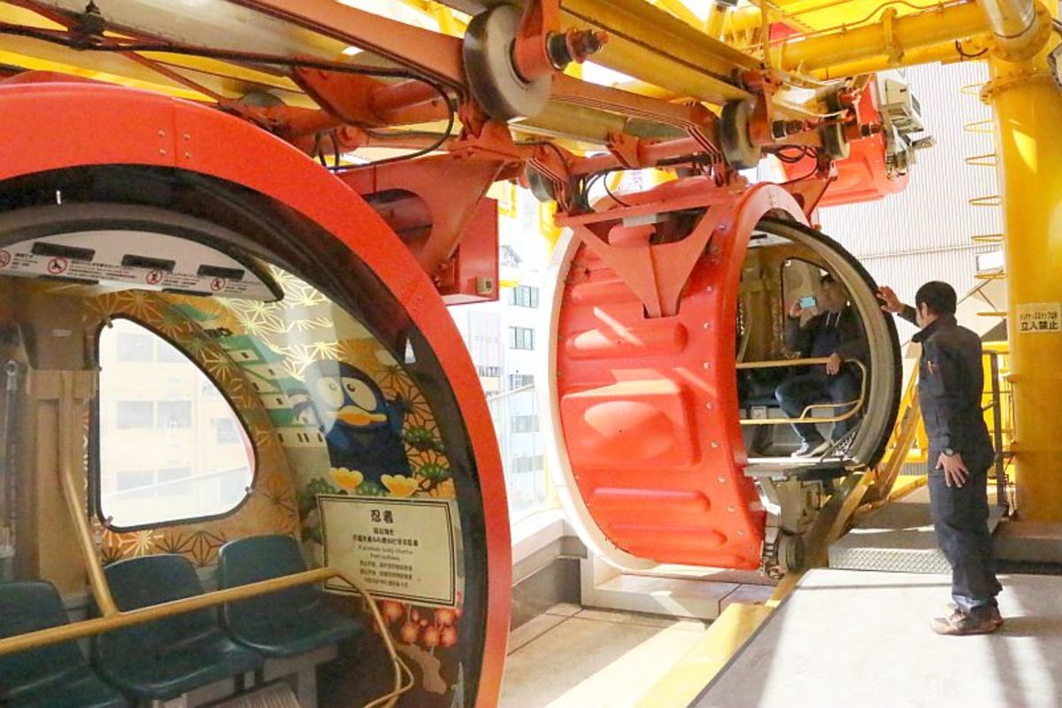 15日午前、報道関係者向けの試乗会が行われた。計32台のゴンドラの内側は、1台ずつ違った縁起物を描いたイラストが施されている。