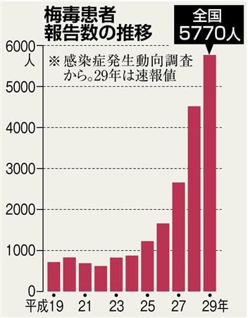 感染研によると、29年の梅毒の患者報告数(速報値)は5770人と、現行の集計になった11年以降初めて5千人を突破した。