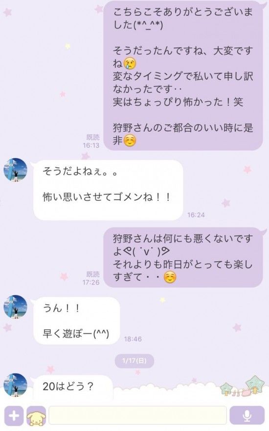 <要約> ・現役女子大生で某女性ファッション誌の読者モデルを務める酒井加奈子さん(仮名・22歳)が1月14日に狩野の自宅マンションを訪れる。 ・狩野、酒井さんを口説く『僕の彼女になってくれないの?』『僕は加奈子ちゃんの彼氏にはなれないの?』(詳細は記事に) ・帰り際に川本真琴と鉢合わせ 「2人でエレベーターに乗って1階まで降りようとホールで待っていたら、女性が1人乗ってきたんです。そうしたら、急に狩野さんが『危ないから下がって』って。何でそんなことを言われたのかわからず、ボーっとしてたら、その女性は『狩野さん』って声をかけてきました。直後には私を睨みつけてきて、『あなた、彼女ですか?』って聞いてきた。『いや、違いますよ』って答えたら、急に笑顔になって『そうなんですか? あ、私が彼女です。付き合ってるんです!』ってすごいテンションでしゃべり始めて本当に怖くなりました。下手すると刺されるかも……と思って、私1人でエレベーターに乗り込もうとすると、女性は『そうそう、エレベーター来てるんだし、早く乗ったほうがいいわよ! 早く!』って。扉が閉まってからは、さらにヒートアップ。狩野さんに、『あいつ、誰!?』って問い詰めている声が聞こえてきました……」 ・翌日のLINEのやり取り。狩野英孝に口説かれた女子大生読者モデル(22歳)が全暴露! 川本真琴と狩野マンションで遭遇し…【LINEスクショも公開】 | 日刊SPA!