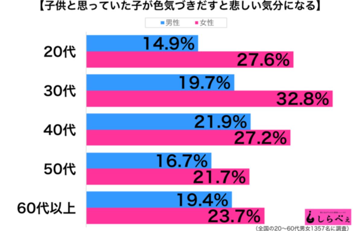 ■進学で都会に出て一気に変化 性年代別でみると、すべての年代で男性よりも女性のほうが多い割合なのが印象的だ。 女性は、小さな変化にも気づくことが多いのだろう。 「素朴な感じの女の子が、進学で東京に行ってから一気に大人の見た目に。 メイクやファッションなどのおしゃれも覚えて、すっかり都会に染まってしまって…。 仕方ないことなんだろうけど、小さな頃から 知っている人間からすると寂しい」(30代・女性)「子供だと思っていたのに…」 成長して色気づくと悲しくなる大人たち