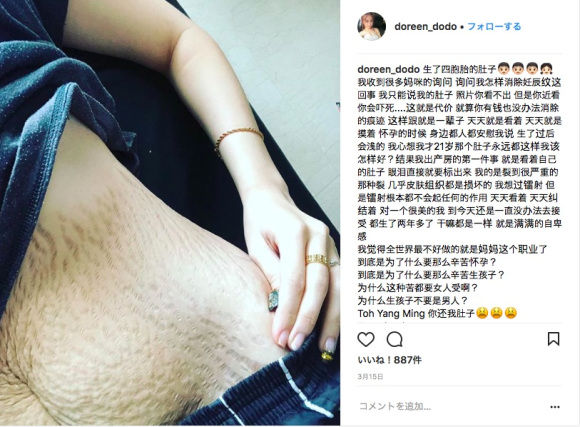 【4人の命を育んできたお腹は…】 ドリーンさんの体には、胸のすぐ下から下腹部にかけておびただしい数の妊娠線がありました。 SNSにアップしている他の写真を見るかぎりでは、非常に華奢な体型のドリーンさん。そんな彼女が4人もの子供を身ごもったら、お腹がはちきれんばかりに膨らんでいたことは容易に想像がつきます。23歳のママが公開した “4つ子を出産後のお腹写真” が大きな話題に / おびただしい数の「妊娠線」が出産の壮絶さを物語っています