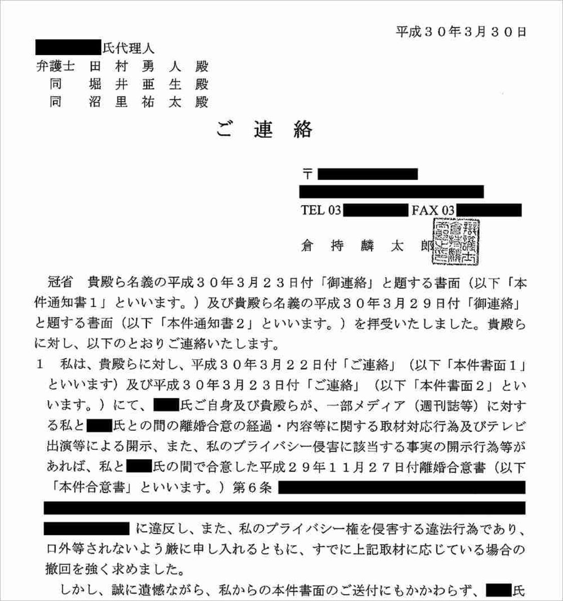 山尾志桜里衆院議員(43)の政策顧問を務める倉持麟太郎弁護士(35)。3月30日、その倉持弁護士が元妻A子さんに対し、メディアの取材に応じないよう圧力とも取れる内容の通知書を送付していたことが明らかに…