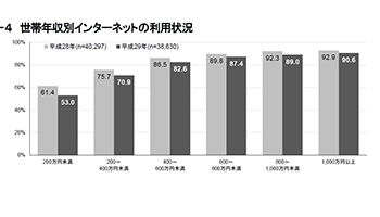 これによると、世帯年収が増えるほどインターネットの利用も増える傾向にある。2017年の世帯年収200万円未満は53.0%なのに対し、200万~400万円未満は70.9%、400万~600万円未満は82.6%、600万~800万円未満は87.4%、800万~1000万円未満は89.0%、1000万円以上は90.6%と、世帯年収の高さに比例してネット利用率も上がっている。