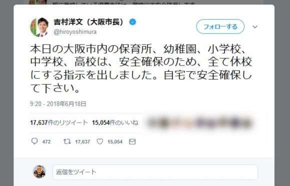 大阪を震源とする地震の発生後、大阪市の吉村洋文市長がツイッターで情報発信を続ける 「既に登校している児童生徒は学校で安全確保します」など27件のツイート・リツイート 「大阪市長、本当に仕事できると思う。東京なら無理だろう」など称賛の声が挙がった