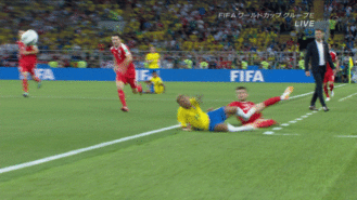W杯サッカーの激しいぶつかりにより、選手が吹き飛ばされる
