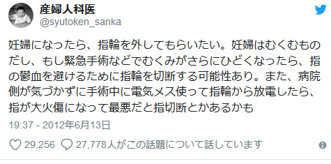 また、「ネイル(ジェルネイル含む)をしていると爪の色がわかりません。 麻酔をかけたりして呼吸状態が悪くなったとき、 爪の色で血液中の酸素濃度を測ります。 昔は採血するしかなかったものが簡易にリアルタイムでわかるようになりました。 酸素濃度の低下は命に直結します。妊婦でなくても危険です」 と補足コメントも。「妊娠したら指輪を外し、ネイルも落として」 医師からの警鐘に背筋が凍る