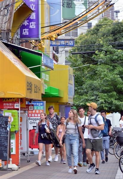 一団が大型のキャリーバッグを引く訪日客の姿が見慣れた光景となった新今宮駅前。大阪市西成区内のゲストハウスに泊まる予定というスイスの女子大学生、メリサ・シュワンダーさん(20)は「安くて空港からのアクセスもいいし、繁華街へも近い」と評価。街の印象について、「悪いイメージはないけど、治安が良くないところなの?」と首をかしげた。