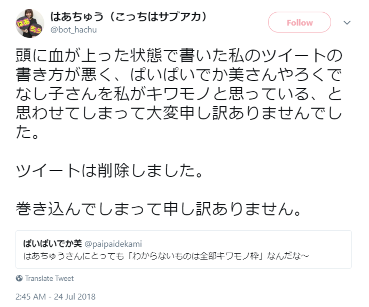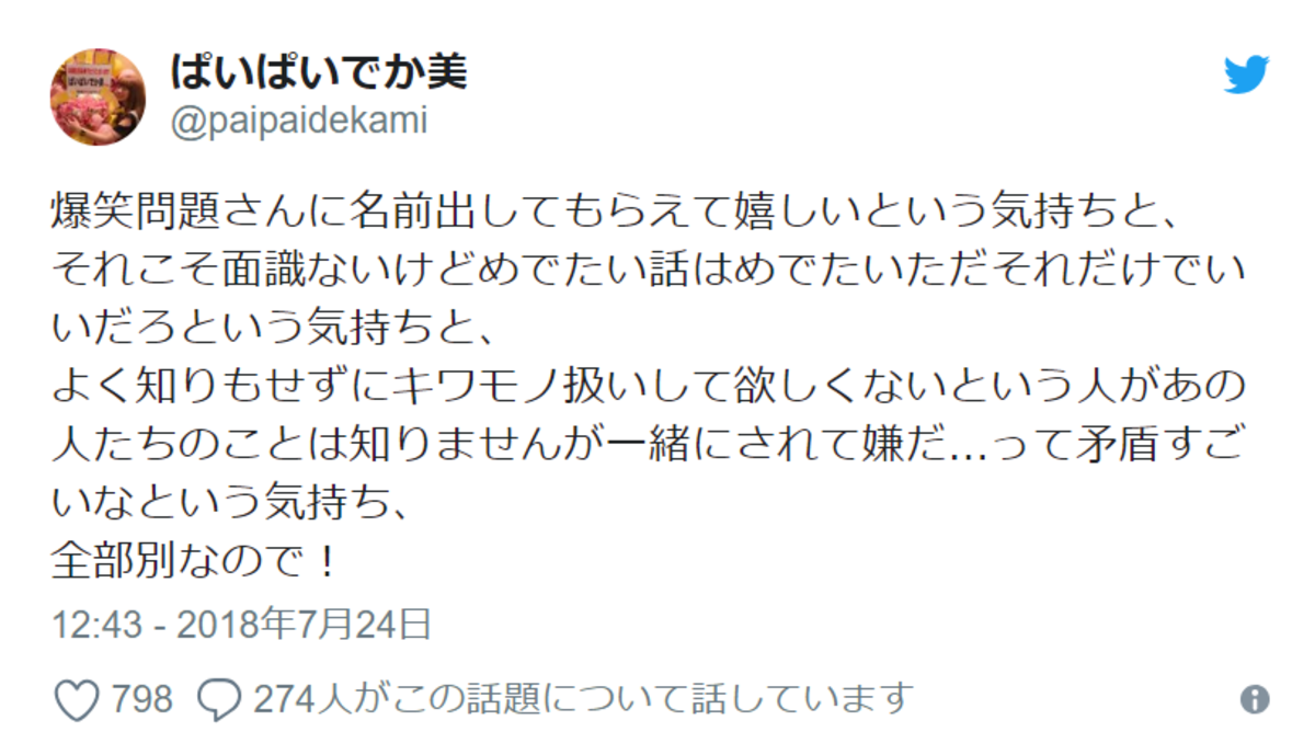 「はあちゅうって誰なんだ?」と田中に質問。田中が人気ブロガーでコメンテーターとしても活動していたことを説明すると「じゃあ、ろくでなし子みたいなもんだ」と合点。「ろくでなし子と結婚してほしかったな、しみけんは。あとは、ぱいぱいでか美とかね」と続けた。 ↓ これに、はあちゅうさんはツイッターで「爆笑問題さんにとってわからないものは全部キワモノ枠だし、キワモノはキワモノ同士くっつけとけって思ってるんだな。人を見下してるよ」と不快感をあらわに。「ろくでなし子とかぱいぱいでか美とか、って言われ方…。ろくでなし子さんとか、ぱいぱいでか美さんをよく知っているわけではないし面識もないんだけど」とつづった。はあちゅう氏が爆笑問題に不快感 ぱいぱいでか美が皮肉 - ライブドアニュース