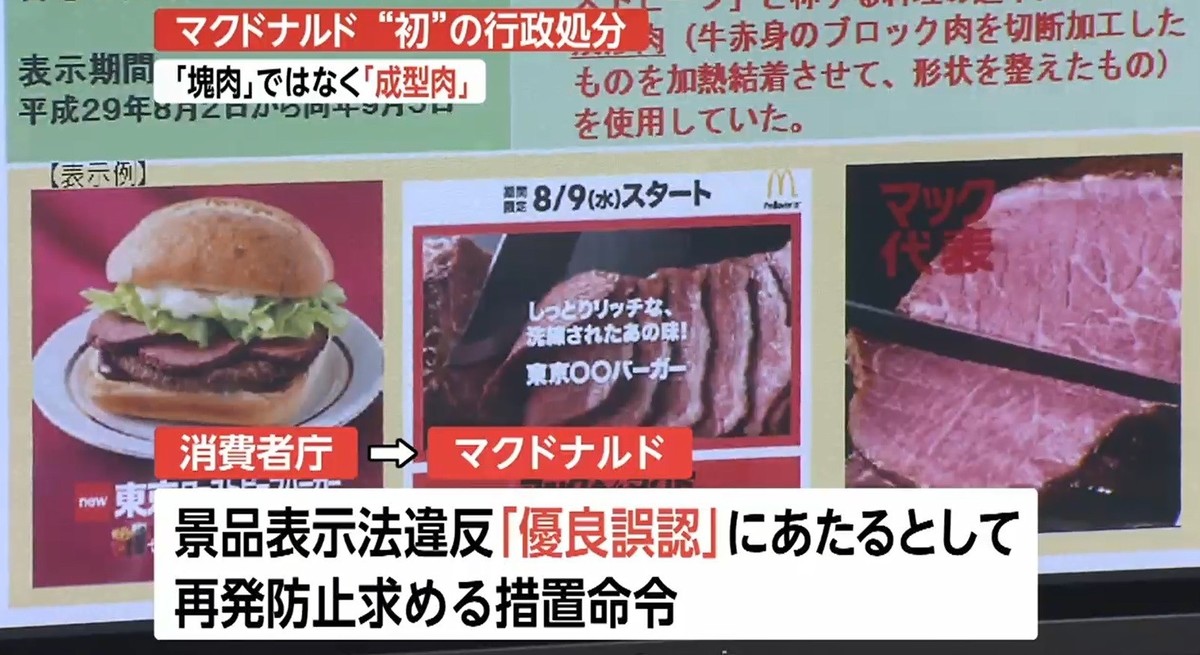 マクドナルドは、当該商品のメニューや広告ポスターで、ブロック肉で作った通常のローストビーフをハンバーガーに使用しているかように表示。しかし実際には、切断された肉を加熱して固めた「成型肉」を多く使っていたのだ。