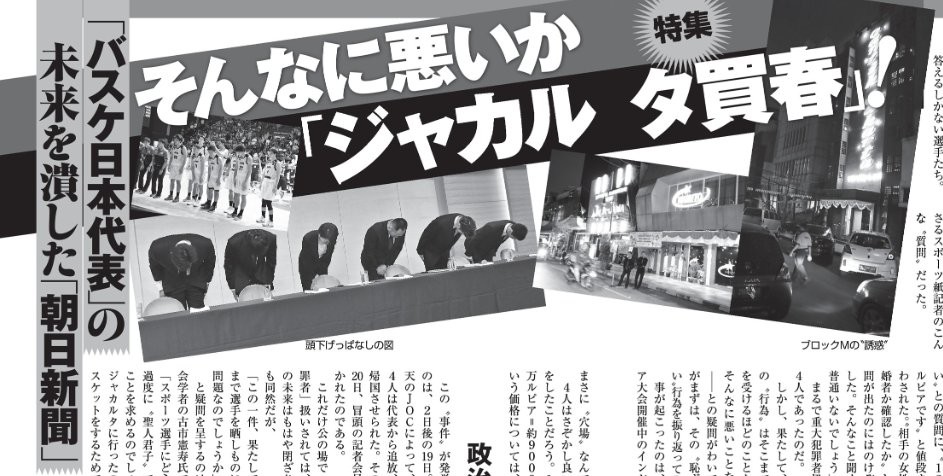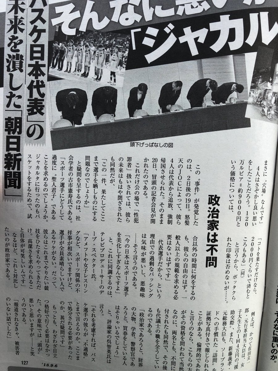 ジャカルタ・アジア大会のバスケットボール男子日本代表4選手が、公式ウェアを着用したまま現地の歓楽街を訪れ、買春行為に及んだ問題で、複数の著名人から「そこまで厳しい処分にしなくていい」といった声が出ている。4選手が所属するBリーグの各チームは2018年8月21日、日本バスケットボール協会の正式な処分があるまで、選手らを謹慎処分にすると発表した。