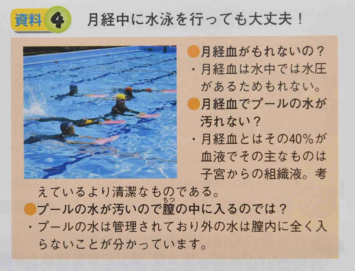 「娘は我慢してプールに入ったけど、変だと思うんです」。中学1年生の娘がいる40代の女性は話す。娘の学校では最初の水泳の授業の前に1時間、オリエンテーションがあった。そこで教師は「生理中でもプールに入れるので、休む理由にはならない」と告げ、「プールの中は水圧があるので経血は漏れない」「プールサイドで血が漏れたときにはホースで水を掛ける」などと説明した。また、プールに入った日数を評価の対象とすることにも触れたという。 生徒の母親は県中学校体育研究会が出している保健の副読本で「生理中のプールは大丈夫」という記述があることに触れ、「生理中のプールは医学的、衛生的に問題はないのか。また『強制ではない』と言っても教科書に『大丈夫』と書いてあると、子どもたちには休むという選択肢がないのでは」と疑問視する。 一部抜粋 保護者が疑問視した「保健学習ノート」の記述生理中のプール授業 医学、人権上問題は? 副読本に「大丈夫」の表記で半強制的に 「休む」選択肢必要(琉球新報) - Yahoo!ニュース