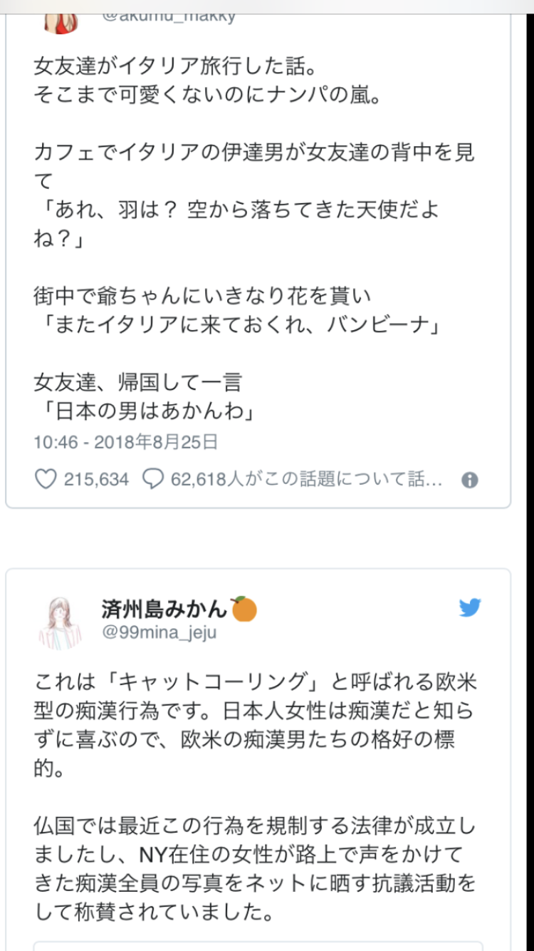 5 匿名さん 18/08/29(水) 06:06 地方から出てきた女が美容師やスカウトやホストに声を掛けられて喜んでるのと同じ感じだね 田舎者で慣れてない女はすぐわかるのと同じで、海外の男もナンパに慣れてない頭悪そうな女もすぐ見てわかるんだろうね 日本人はビジネス以外ではブスやデブに声を掛けないけど海外だと誰でもいい男多いからね。海外にも面食いはいるけど