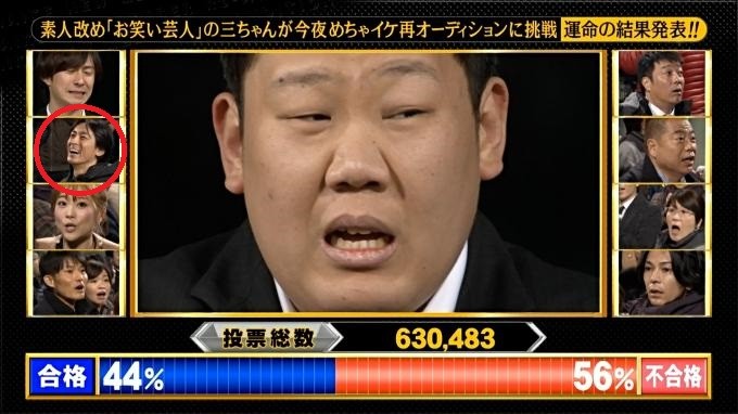 よしもとクリエイティブ・エージェンシーに所属する“三ちゃん”こと三中元克(25)が27日、プロの芸人としてレギュラーを務めるフジテレビ系バラエティー番組『めちゃ×2イケてるッ!』の再オーディションを受け不合格。番組を卒業することが決まった。  高校の同級生、臼杵寛(うすき・かん 24)とお笑いコンビ・サンプライズを結成した三中。この日、番組生放送内で、プロ芸人として改めて同番組の再オーディションでネタを披露。審査員である視聴者がデータ放送やスマホで投票する“国民投票”で「不合格」が過半数を超え卒業が決定した。  結果を受け三中と臼杵は呆然。めちゃイケメンバーも「うそでしょ? うそでしょ?」と動揺を隠し切れず、ナインティナインの岡村隆史(45)は「もう1回、もう1回」と懇願。それでも、佐野瑞樹アナウンサー(42)は「もう1回はありません」といい「不合格」が言い渡された。  岡村は三中に向け「またオーディションしようや! 仕事もまた入るかもしれない」と呼びかけ、加藤浩次(46)も「(めちゃイケに)ゲストで出ればいい」と必死にフォロー。すると、再試験を見守っていたみちのくプロレス・新崎人生社長(49)が「あした(スケジュール)空いてる?」と、早くもプロレス出場のオファーをサンプライズに申し出ていた。  三中は2010年10月に当時長期休養中だった岡村の穴を埋めるべく行われた『めちゃイケ新メンバーオーディション』で約1万人の中から選ばれたメンバーで唯一の“素人”として番組で活躍した。