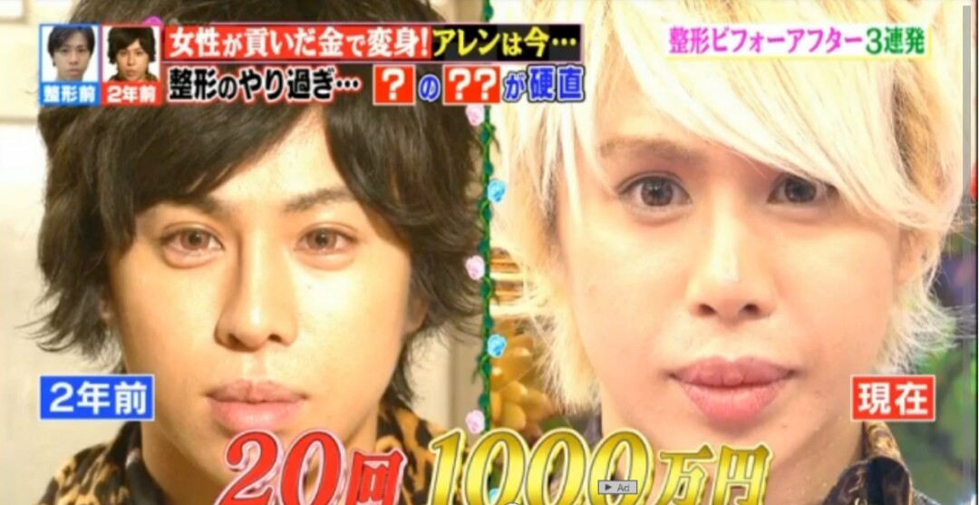 352 匿名さん 16/03/24(木) 00:32 女性が貢いだ金で変身! アレンは今・・・ 目はぱっちりしたね、前よりか。 「整形のやり過ぎ・・・? の??」 が硬直って。。。?もう整形しすぎて解らないよ。