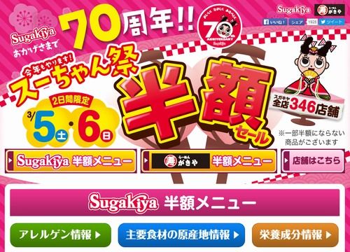 スガキヤは3月5日と6日の2日間、毎年恒例の「スーちゃん祭」を開催。例年と同様に、ラーメンやソフトクリームなどの半額セール(※一部商品除く)を実施する。実施店舗は全店(346店舗)。