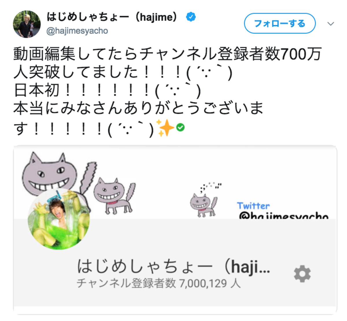 SNSマーケティング分析ツール「Social Insight」によれば、700万人を突破しているチャンネルは、10月20日時点で国内でははじめしゃちょーのみ。はじめしゃちょー、YouTubeのチャンネル登録700万人突破。日本人初