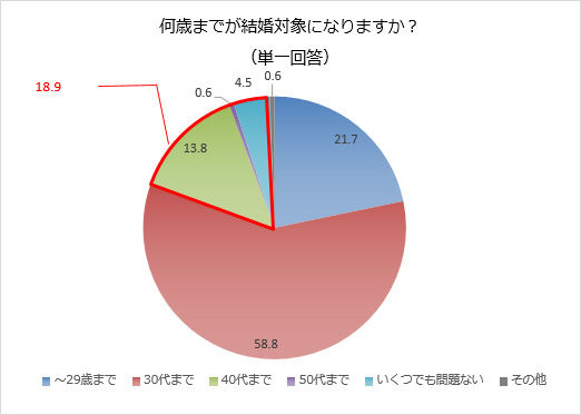 「40代まで」、「50代まで」、「いくつでも問題ない」と回答した人を合わせると18.9%である点。若い女性たちの約5人に1人が、年上男性を結婚対象として見ているという結果となった。