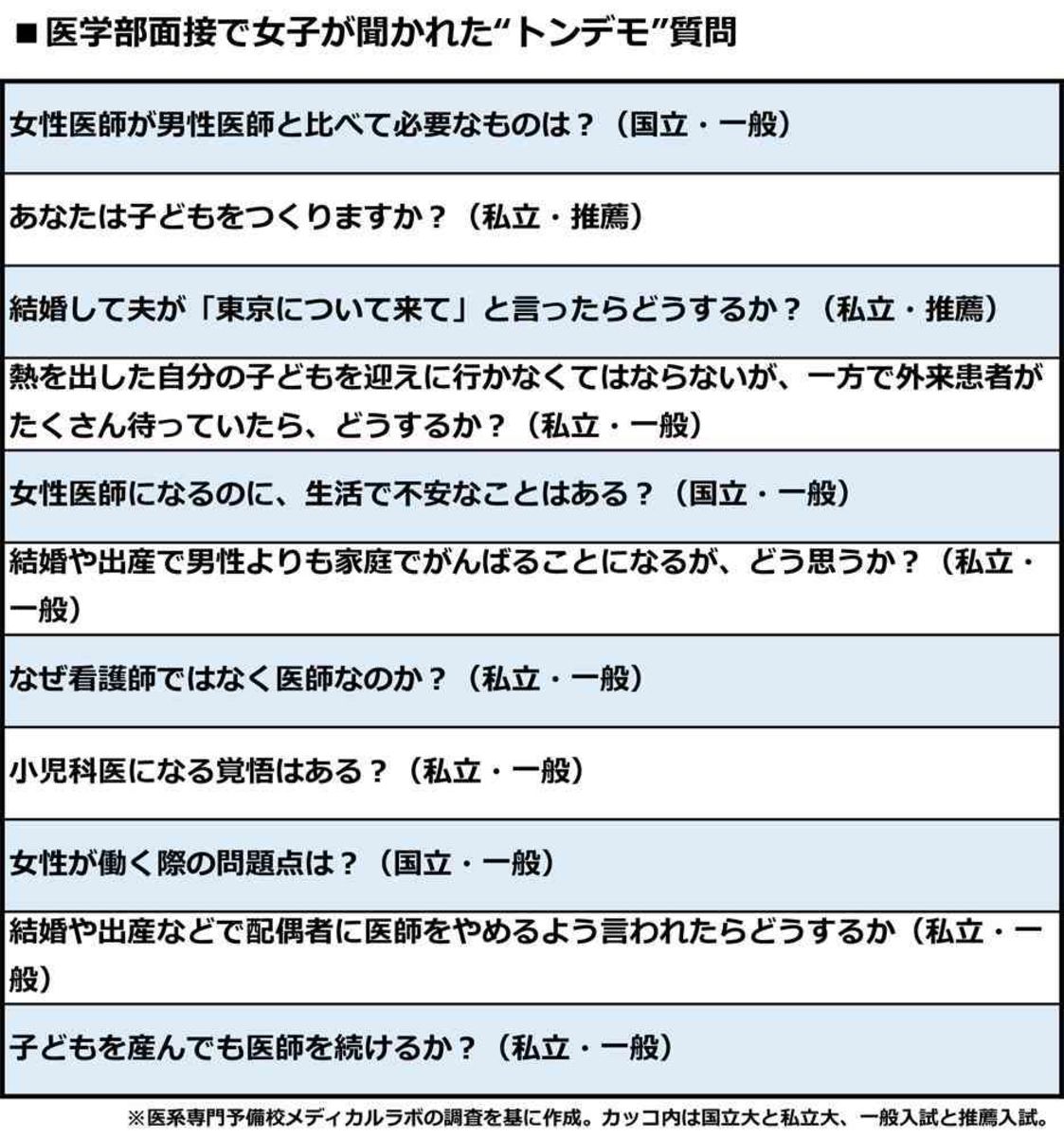 まもなく平成が終わろうとしているこの時代とは到底思えない「質問」ではなかろうか。「あなたは子どもをつくりますか」「なぜ看護師ではなく、医師なのですか?」「子どもを産んでも医師を続けますか」 これらは...
