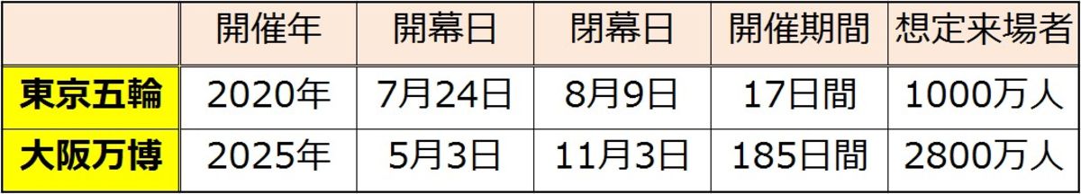 1 匿名さん 18/12/10(月) 22:58 東京五輪よりも遥かに大規模なイベントの大阪万博 開催期間が短い東京五輪の方が大阪万博よりも10倍も開催費用がかかるなんておかしい 【開催年】 東京五輪 2020年 大阪万博 2025年 【開幕日】 東京五輪 7月24日 大阪万博 5月3日 【閉幕日】 東京五輪 8月9日 大阪万博 11月3日 【開催期間】 東京五輪 17日 大阪万博 185日 【想定来場者】 東京五輪 1000万人 大阪万博 2800万人