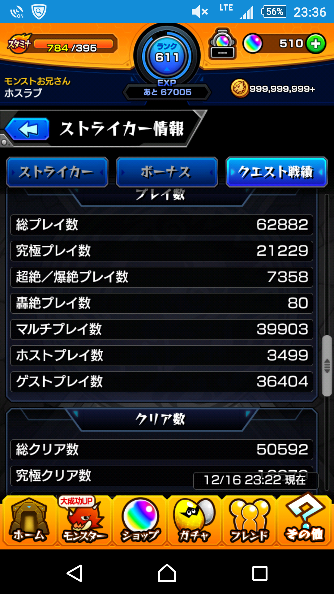 課金年間2~3万 ゲームはモンストのみ、一日平均5~6時間ぐらいかな? 既婚者、運転手です