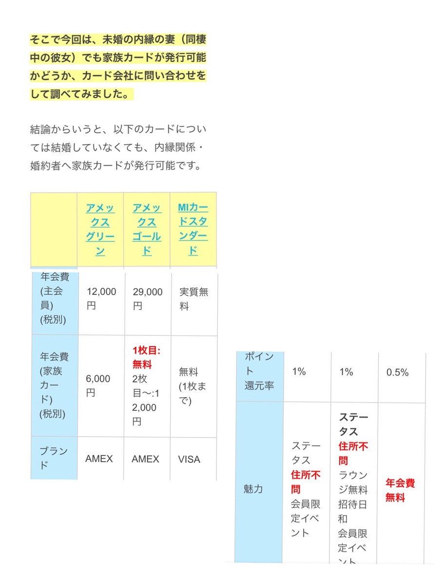 >>8 結婚してなくても家族カード持てるよ。 3年同棲してた彼氏から私名義の家族カード貰ってた。 いまネット見て、住所不問ってのには驚いたけど、彼氏が彼女にクレカを持たせるのは違法じゃない。