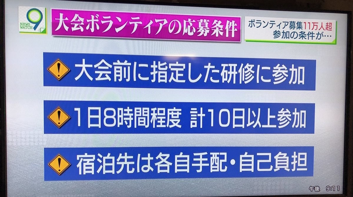 東京オリンピック・パラリンピックの都市ボランティアの応募がきょう21日(2018年12月)に締め切られた。おとといまでは目標の2万人に達していなかったが、なぜか19日になって2万8000人の増え、目標を大幅に超えた。--- 『東京オリ・パラのボランティア』都立高校生に強要!応募用紙配って「全員書いて出せ」 : J-CASTテレビウォッチ ---