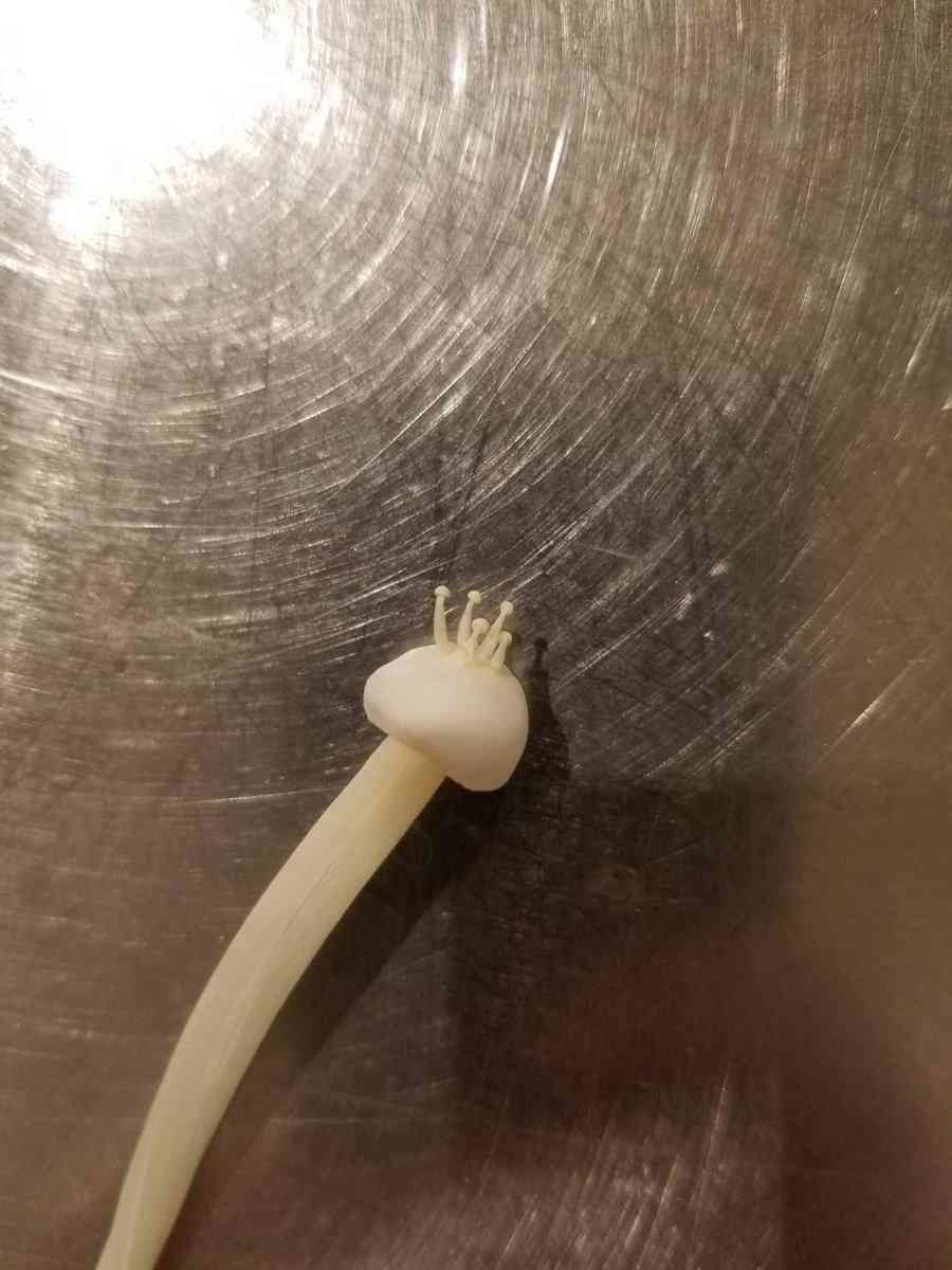 ある冷蔵庫から発見されたエノキダケが話題 よく見るとカサからさらに小さなエノキダケが Twitterで「寄生獣」「ナウシカの研究室」などの反応がズームで見ると……キャーッ! 「エノキから生えた小さなエノキ」にゾワゾワする人続出