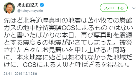 鳩山氏は地震発生の3時間前に「先日昨年の北海道厚真町地震が高圧でCO2を地下に貯蔵するCCSにより人工的に引き起こされたのではないかと書いた。実際、北大の研究者が5年前にその可能性があるとする論文を発表していた。日本では地震の影響を考慮するとCCSは非現実とも述べている。政府は決して認めないだろうがCCSは再考すべきだ」とツイート。独自調査の結果として、昨年の地震が「人災」である可能性を指摘した。 これが“的中”したことで確信を強めたようだが、不謹慎と受け止める声はあっても、人災と捉える声は少ない。21日に北海道で発生した地震 鳩山由紀夫氏が「人災」と断定し波紋 - ライブドアニュース