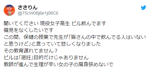ピルを避妊のための薬としかみなしていないような、先生の発言。まるで「ピルは高校生が使ってはいけない薬」とでもいうようです。 教師という立場であるにもかかわらず、偏見にまみれた先生の言葉に、投稿者さんは悲しくなったといいます。 また、保健の教科書にも『避妊をするための方法』という用法しか書かれていなかったのだとか。保健の授業で、先生の『ひと言』に女子高生が苦言 「その教育遅れてません?」