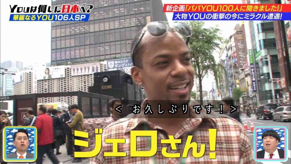 番組が新橋駅前で実施した街頭インタビューに応じたジェロ。ガラリと変わった風貌にスタッフもはじめはジェロだと気付かなかったようだ。 演歌界初の黒人演歌歌手として2008年にデビューし、『海雪』で第50回レコード大賞最優秀新人賞を受賞したジェロだが、現在は歌を辞め(無期限の活動休止)ITの仕事をしていると話す。 歌手活動を続けながら、2年ほど通信の大学院で勉強していたそうで、「またいつか歌の世界に戻ってくることは?」との質問には、「今のところはないですね。ITの仕事を頑張ってみようかなっと思って」と答えていた。『YOUは何しに日本へ?』歌手・ジェロの現在が放送され騒然 「マジか…」