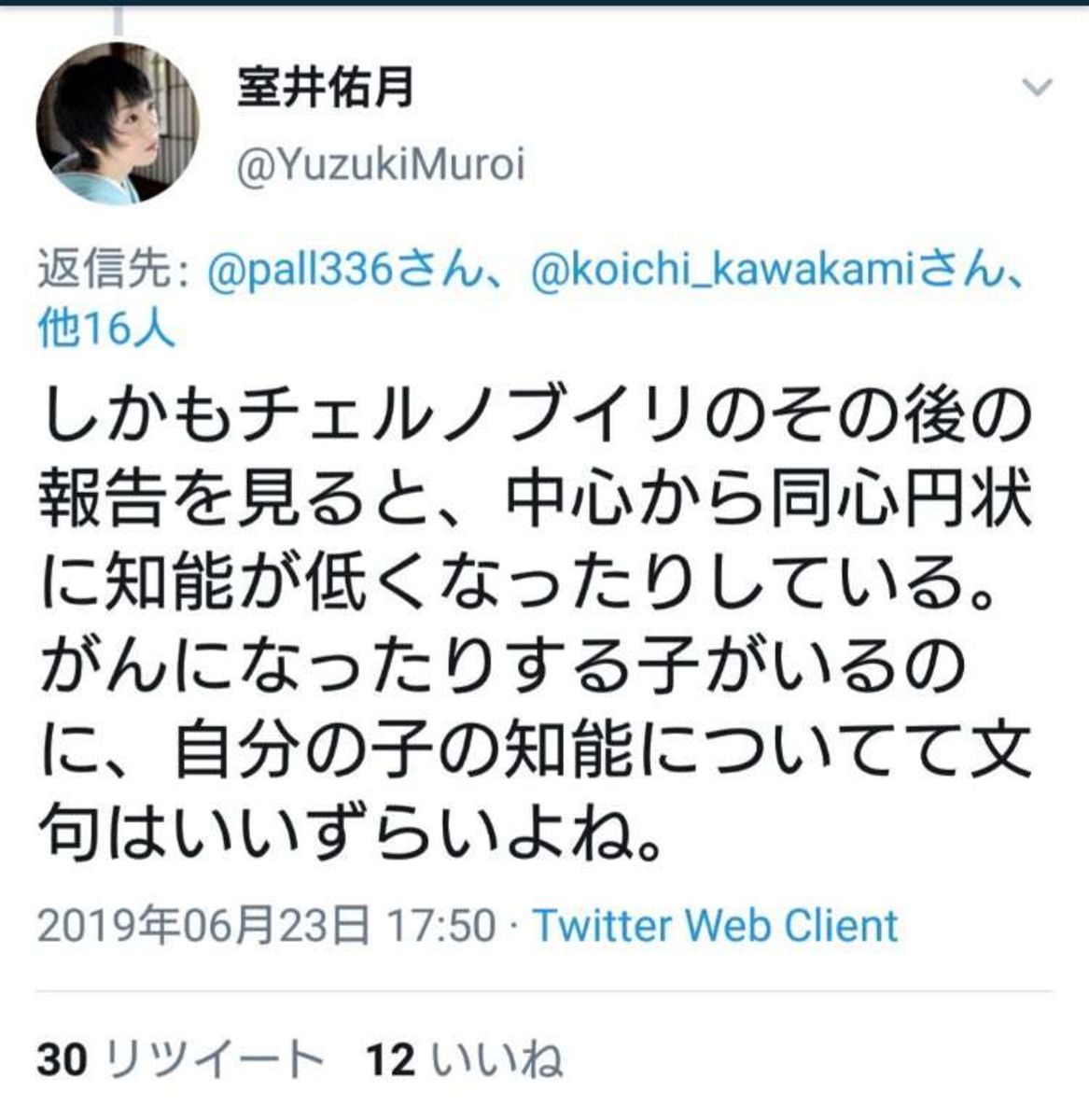 作家の室井佑月のツイッターでのある発言が、ネット上で炎上している。 室井は23日にツイッターを更新。一般ツイッターユーザーの放射能問題に関するやり取りに言及し、「しかもチェルノブイリのその後の報告を見ると、中心から同心円...