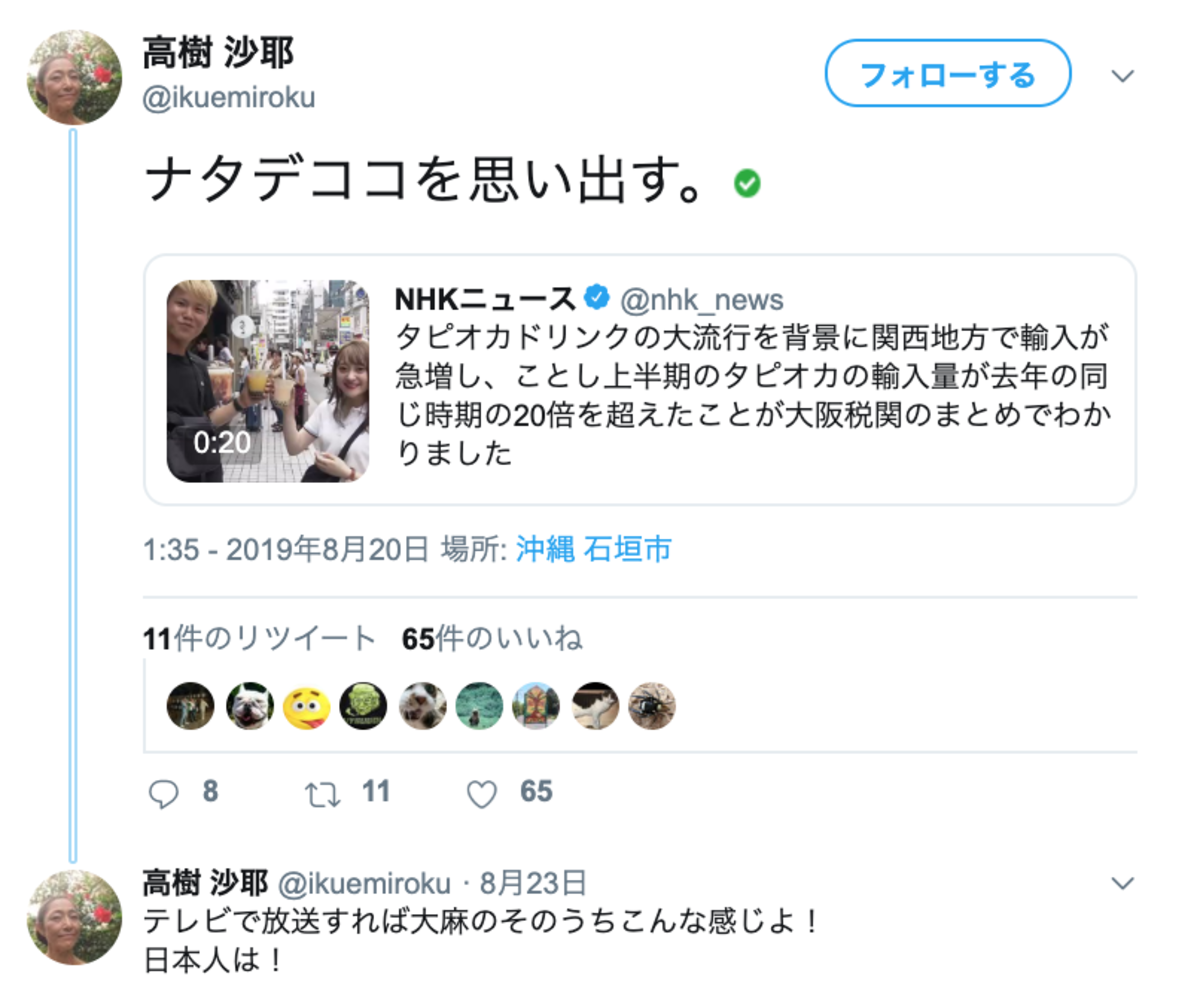 8月20日には、ブームでタピオカの輸入量が昨年の20倍になったとのニュースを引用し、「ナタデココを思い出す。」とかつてを振り返った。そこまでは良かったが、3日後、思い出したかのように、またツイートして「テレビで放送すれば大麻の(ママ)そのうちこんな感じよ! 日本人は!」と、「大麻ブーム」が来ない理由はテレビのせいと言わんばかりなのである。 翌日、改めて高樹に聞くと、 「ネットをやっている人はそうじゃないけど、テレビの情報だけを信じる人はいつまで経っても大麻は悪いものだと考えている。タピオカの話はそれを言いたかったの」高樹沙耶「大麻はタピオカのようなブームになる」と発言 | デイリー新潮
