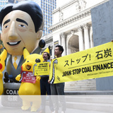 抗議デモの参加者は環境NPO「オイル・チェンジ・インターナショナル」の職員ら約20人。ニューヨークの路上で、石炭バケツの上に立つ笑顔の安倍晋三首相を模した高さ4メートルの風船を掲げ、「石炭はいらない」と英語で声を張り上げた。