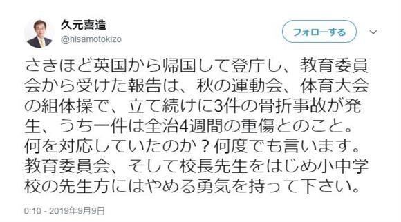 神戸市の久元喜造市長は9日、市立小中学校で組み体操の練習中に骨折を含む事故が相次いだとして、ツイッターで組み体操を中止するよう求めた。事故は27日時点で骨折5件を含む43件となった。 市長の中止要請に強制力はなく、市立小中学校では今秋、168校中92校が運動会で組み体操を実施する予定だ。市教委の担当者は「組み体操に教育的意義を感じている学校は多い」と強調。「今年の事故の多くは、倒立など2人組の技で起きたもの。そもそも倒立は学習指導要領に明記され、授業でやらなければならない。運動会で組み体操を中止しても事故を減らすことにつながるのか」と疑問を示し、来年度以降の対応を決めかねている。「やめる勇気」悩む現場 組み体操事故、神戸で相次ぐ:イザ!