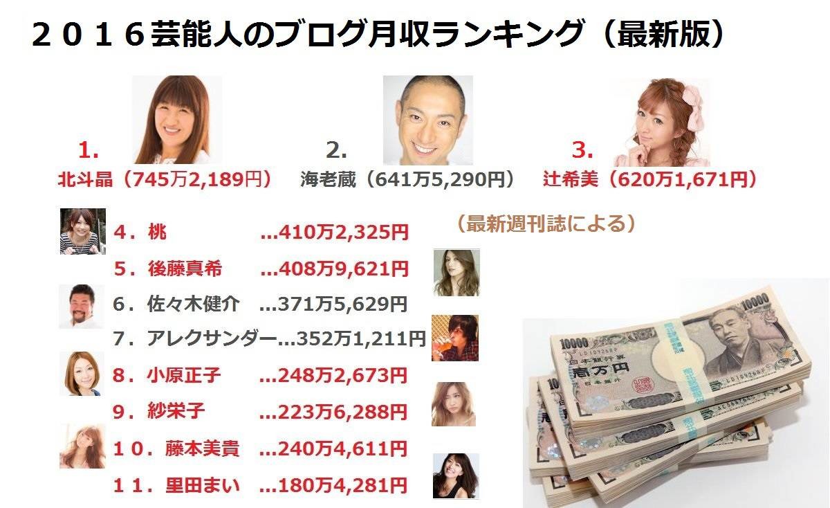 1 匿名さん 16/04/07(木) 18:11 北斗晶 745万2189円 市川海老蔵 641万5290円 辻希美 620万1671円 桃 410万2325円 後藤真希 408万9621円 佐々木健介 371万5629円 アレクサンダー 352万1611円 小原正子 248万2673円 紗栄子 223万6288円 藤本美貴 240万4611円 里田舞 180万4281円