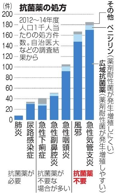 抗菌薬が必要とされる疾患に処方されたのは全体の8%にとどまった。処方された56%は風邪や急性気管支炎など通常はウイルスが原因の病気だった。 処方された抗菌薬の86%は様々な種類の細菌に効く「広域抗菌薬」と呼ばれるタイプ。耐性菌が発生、増殖しやすいため、欧州ではまれにしか使われない。抗生物質の6割、効果ない風邪などに処方 自治医大調査(朝日新聞デジタル) - Yahoo!ニュース