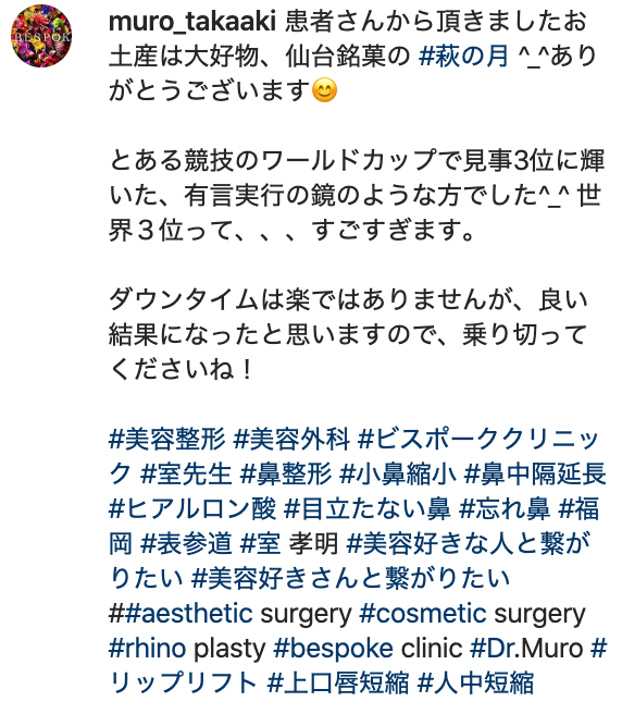 (出典 【美容整形】某有名女性アスリートか 福岡の美容形成医師の投稿が話題)1 ひかり ★ :2020/01/12(日) 00:21:05.20 muro_takaaki 患者さんから頂きましたお土産は大好物、仙台銘菓の #萩の月 ^_^ありがとうございます? とある競技のワールドカップで見事3位に輝い